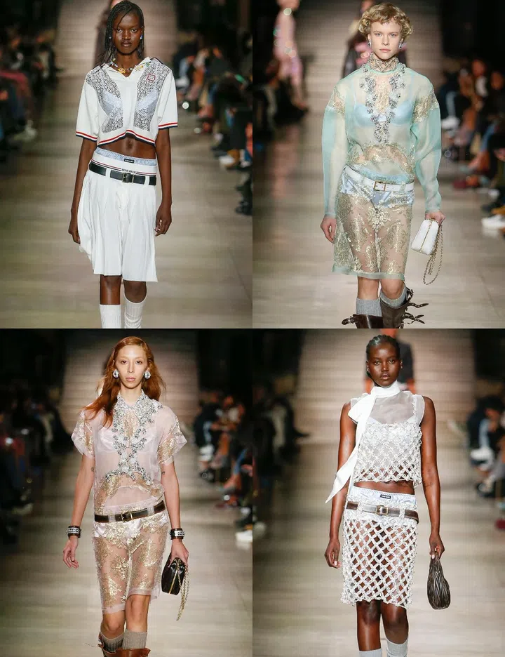 Miu Miu showed how to take intimate dressing to the next level. Alternative suggestions included flashing hints of shiny satin bloomers above the waistband or donning coloured bras underneath a mesh top or a sheer crystal-encrusted dress.