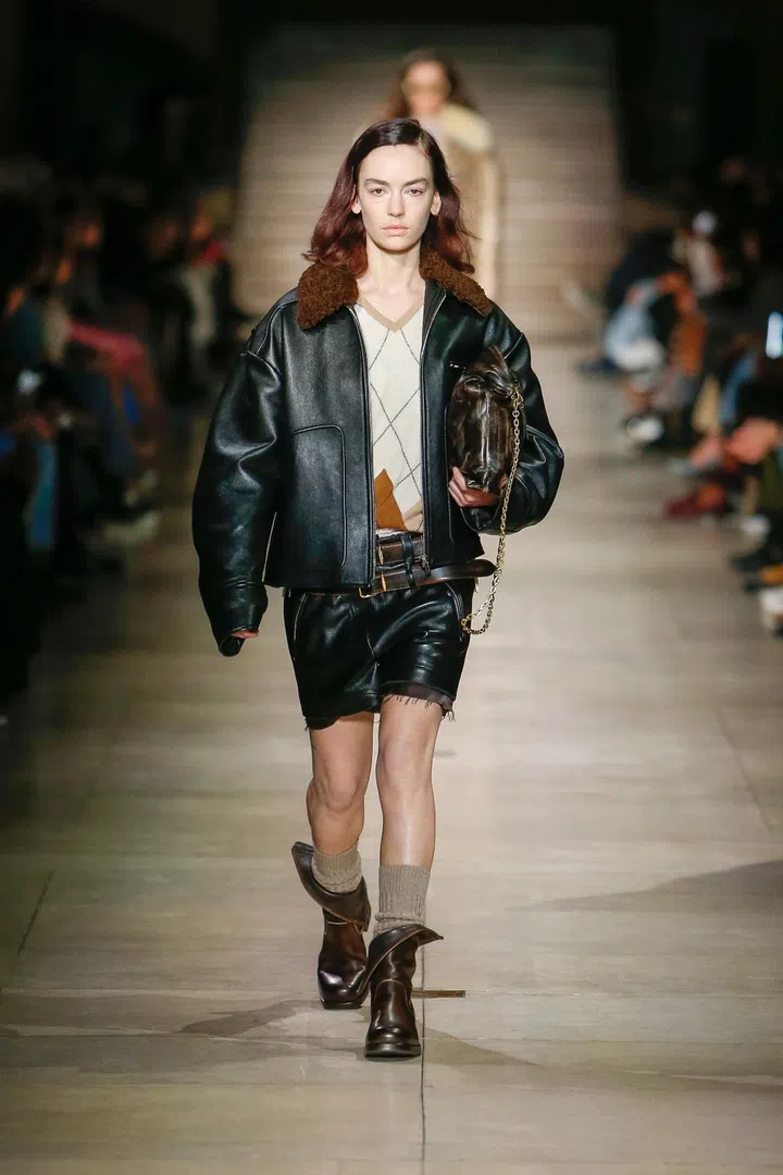 Miu Miu’s beloved micro miniskirts from the S/S ‘22 show were back — this time in white tennis-inspired designs as well as distressed leather and plaid micro shorts which gave the style a more grown-up appeal. For a little Miu Miu quirk, note the double belts on the waist.