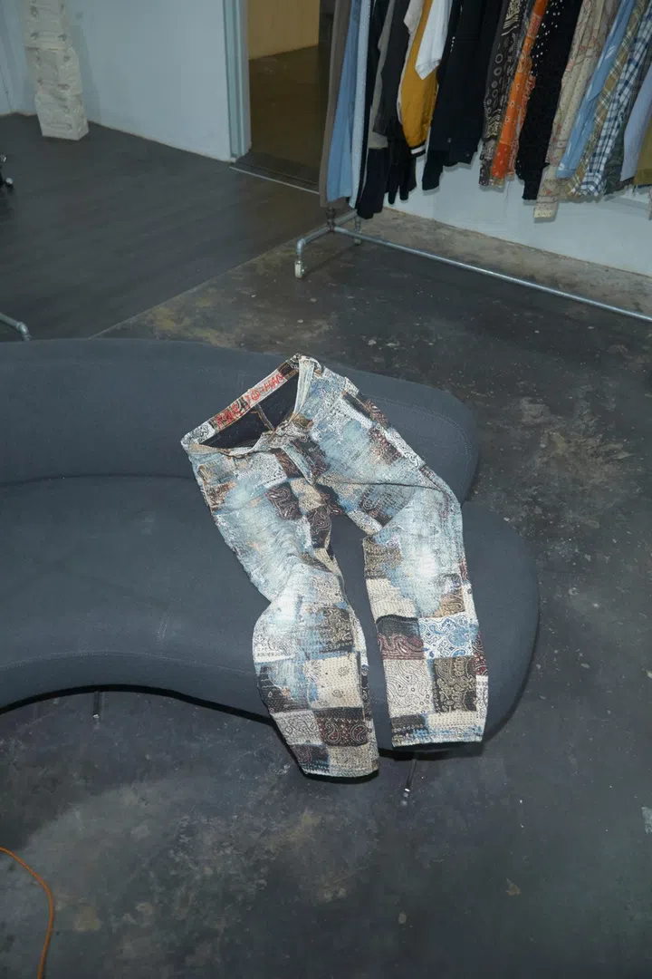 A pair of custom Proleta Re Art jeans at Lithium, which was fashioned out of antique bandanas from the 1900s, according to Lithium's resident art curator Han Goh.