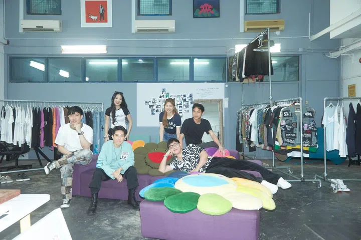 The team behind hybrid art and fashion space Lithium comprises (clockwise from left) Han Goh, Jan Cheng, Tiffany Chen, Kiefer Tay, Kent Ho and Pin Goh (seated in foreground), with member Jacky Lim not in picture as he was unable to make the shoot.