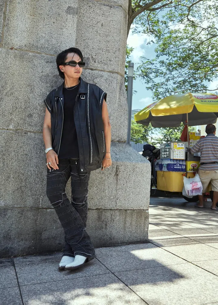 Azri wears Celine by Hedi Slimane leather vest and boots. All other clothes and accessories, his own