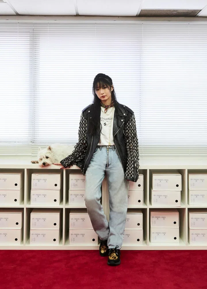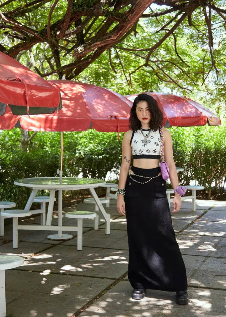 Yip wears Celine by Hedi Slimane leather jacket, Celine; and The Salvages cotton T-shirt, and suede and rubber sneakers, Dover Street Market Singapore. All other clothes and accessories, her own