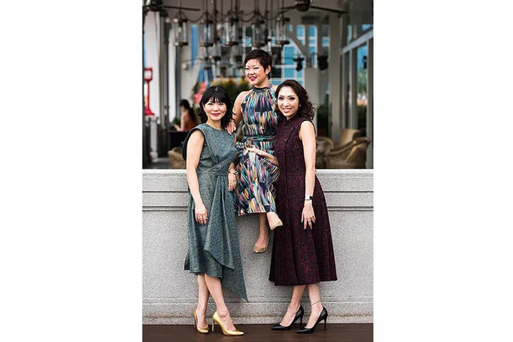 Close friends Jassica Lee (left) and Ng Ping Ching (right), who work in the banking sector, and Sheralyn Tay (centre), who runs her own editorial consultancy, founded Tria the Label in 2016. ST PHOTO: Lee Jia Wen