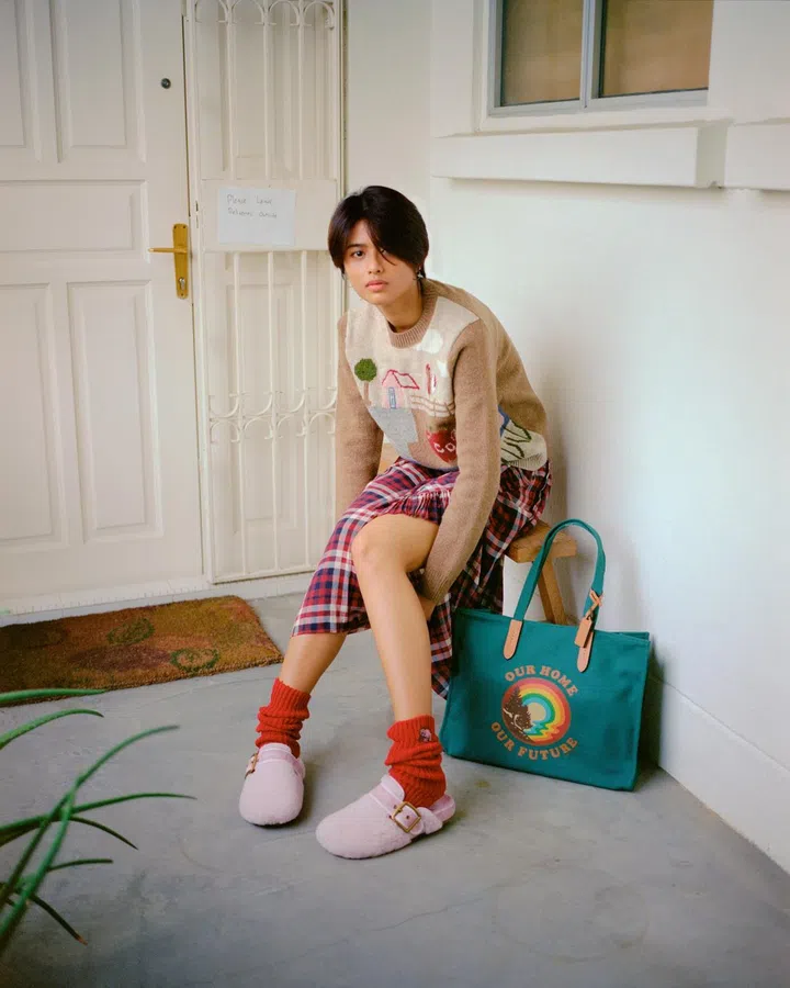 Wool sweater, cotton skirt, recycled cotton and leather tote, embellished cotton socks and shearling clogs, Coach