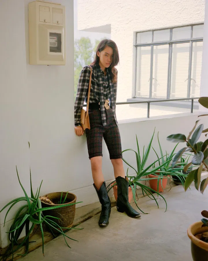 Saint Laurent by Anthony Vaccarello lavalliere wool blouse, tweed shorts, suede belt and Kaia vegetal leather shoulder bag, Saint Laurent. Boots, stylist’s own