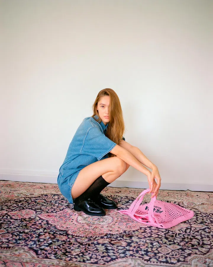 Organic denim playsuit, cotton socks, leather loafers and raffia tote, Prada