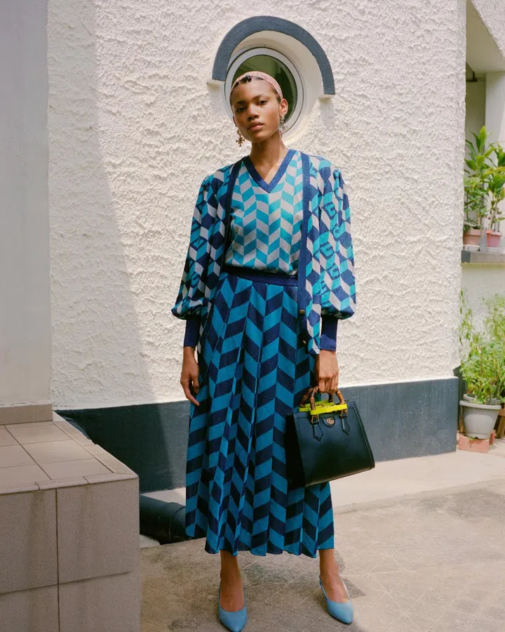 Lamé jacquard cardigan, vest and skirt, 925 sterling silver earrings, Diana leather tote and matelasse leather slingback pumps, Gucci. Headscarf, model’s own