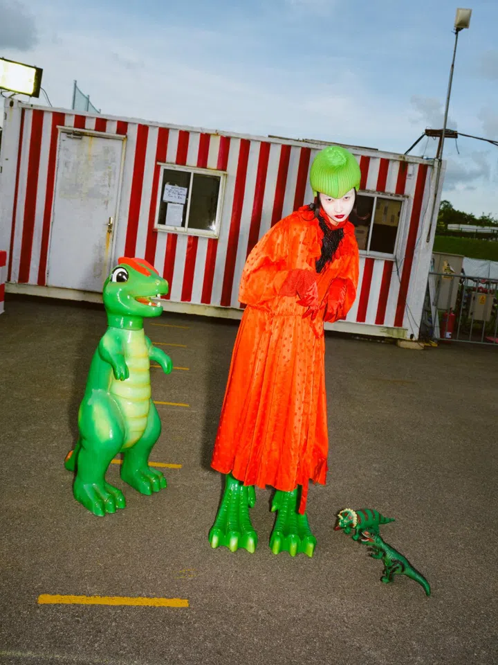 Viscose dress and viscose-blend turtleneck top (worn as innermost layer), Balenciaga. Cotton and nylon knit top with feathers, Salvatore Ferragamo
