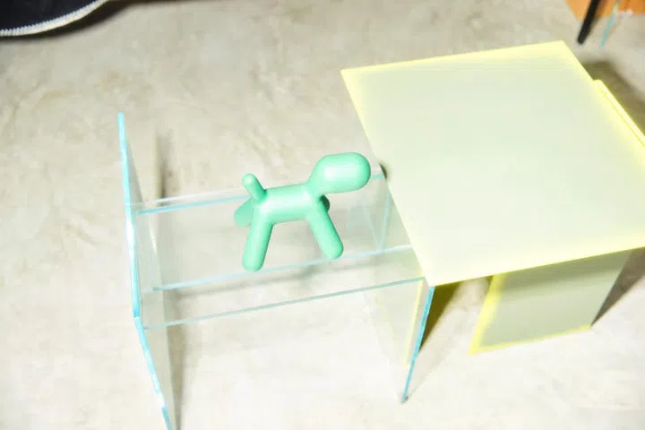 "This coffee table is a gift from my friends who run the furniture store Made & Make. The table is the Daze side table designed by Studio Truly Truly for Tacchini. It’s composed on sheets of bent metal that have been hand-coloured in two layers of paint with a faded effect at the edges. It’s somewhere between a piece of furniture and minimalist sculpture. The dog is a year-end gift from Xtra. It’s made by Magis."