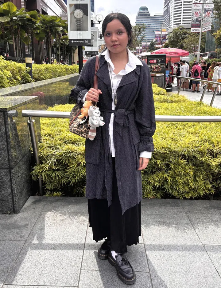 Inspiration behind her outfit: “The main character of an anime called Paradise Kiss, Yukari Hayasaka, inspired me to explore the world of fashion even further and gave me the confidence to express myself, even in humid weather. When deciding on this outfit, I imagined myself in her shoes and styled myself based on what I think she would do, as the coat reminded me of her.”