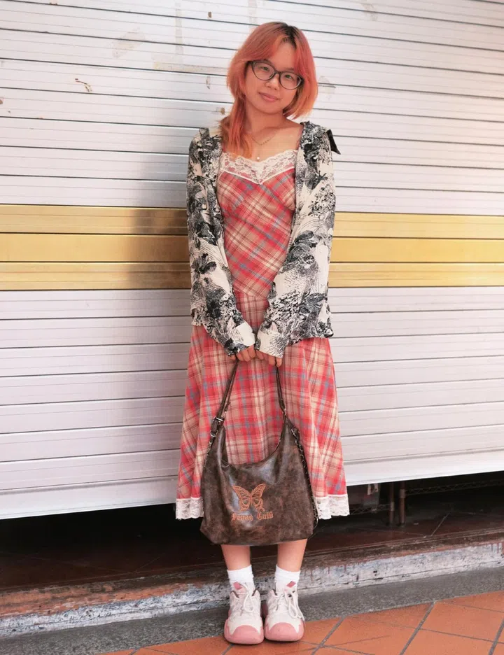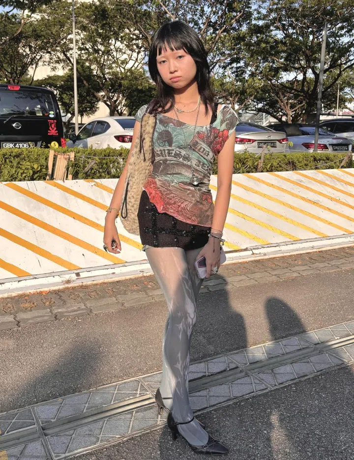 Her fit: “Both of my tops and my bag are from a store called Dirty Laundry. My shoes are from Kumi Vintage, the stockings are from Taobao, and my necklaces are from Vivienne Westwood and Taobao. I got my bracelets from Pandora, Vivienne Westwood, my mum, and my friends."
