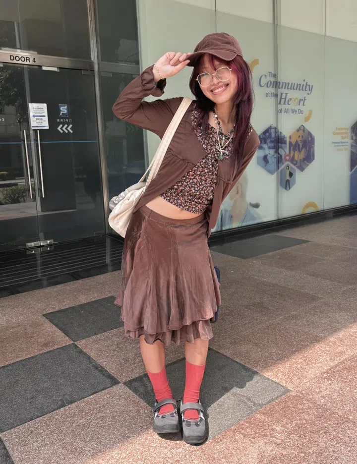 Her fit: “I got my top and skirt from clothing Telegram channels. My cardigan is from Uniqlo, and my bag is from re.drmg. My shoes are from Charles & Keith, my glasses are from my grandmother, my necklace was gifted by a friend, and my belt is from Un.wastelands.”