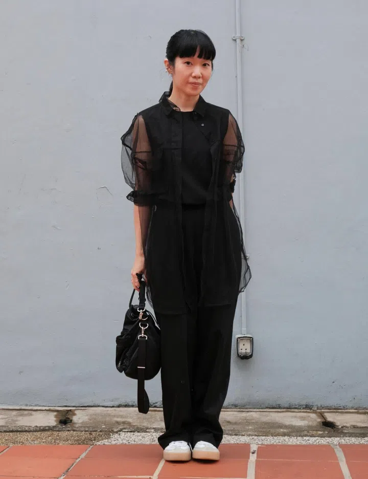 Her fit: “My outer top is unbranded and I got this more than five years ago. My inner top is from Beyond The Vines, and my pants are from Uniqlo. I got my bag from Porter Yoshida, and my earrings from Mormormor.”