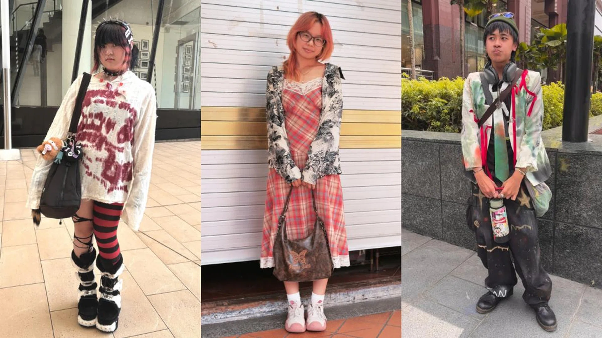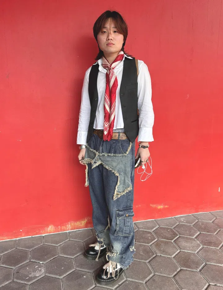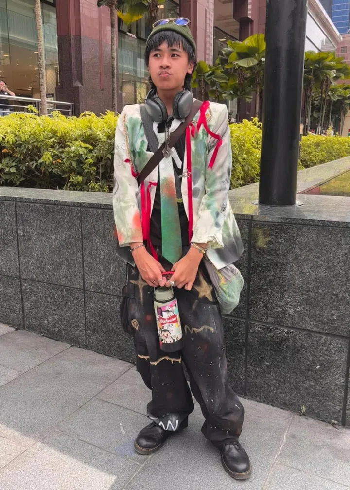 His fit: “My outfit was mostly reworked and handmade by me. I made my bag during the June holidays because I was bored with my other bags, which just weren't giving me enough style. The pants were upcycled from really oversized black cargo trousers, and the chains were handmade from random items. My secondary school CCA was throwing away old, unused blazers, so I took one, styled it, and upcycled it. Other than that, the beanie was a gift from my cousin, and the top is a Playboy Bunny long-sleeve polo that I thrifted from Lucky Plaza. My shoes are Dr. Martens.”
