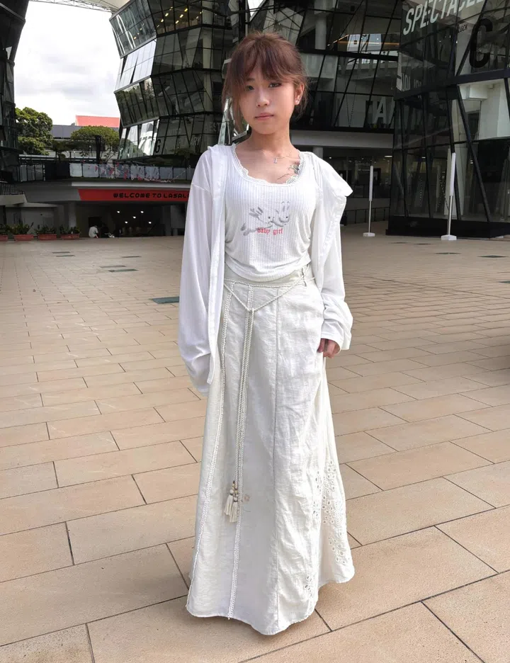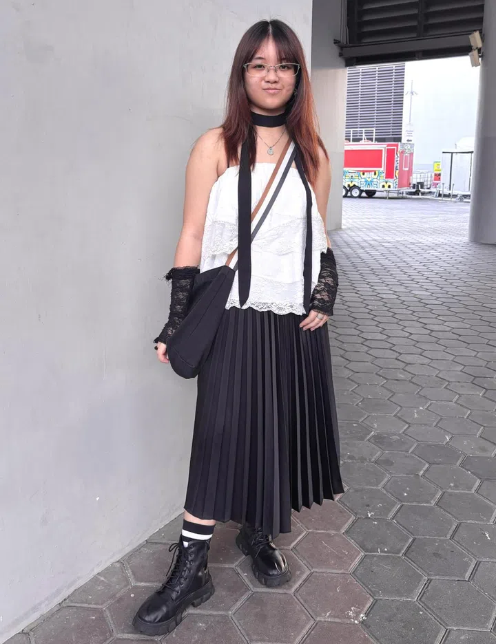 Inspiration behind her outfit: “Although I didn't have a strict inspiration for my outfit, I loosely followed the relaxed and feminine silhouette of Japanese fashion, as my top and skirt are from Japanese labels. I was more focused on how I could creatively yet cohesively mix and match pieces I don't wear at all, and I paired my pieces to make a monochrome outfit.”