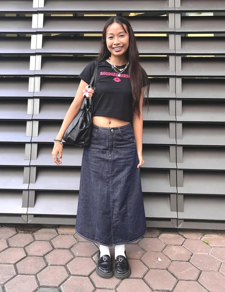 Her fit: “My top is from Conan Gray’s tour merchandise. My skirt is a hand-me-down Levi’s skirt, and my shoes are from Shein. I got my bag from Taobao, and my accessories from Taobao and Shopee.”