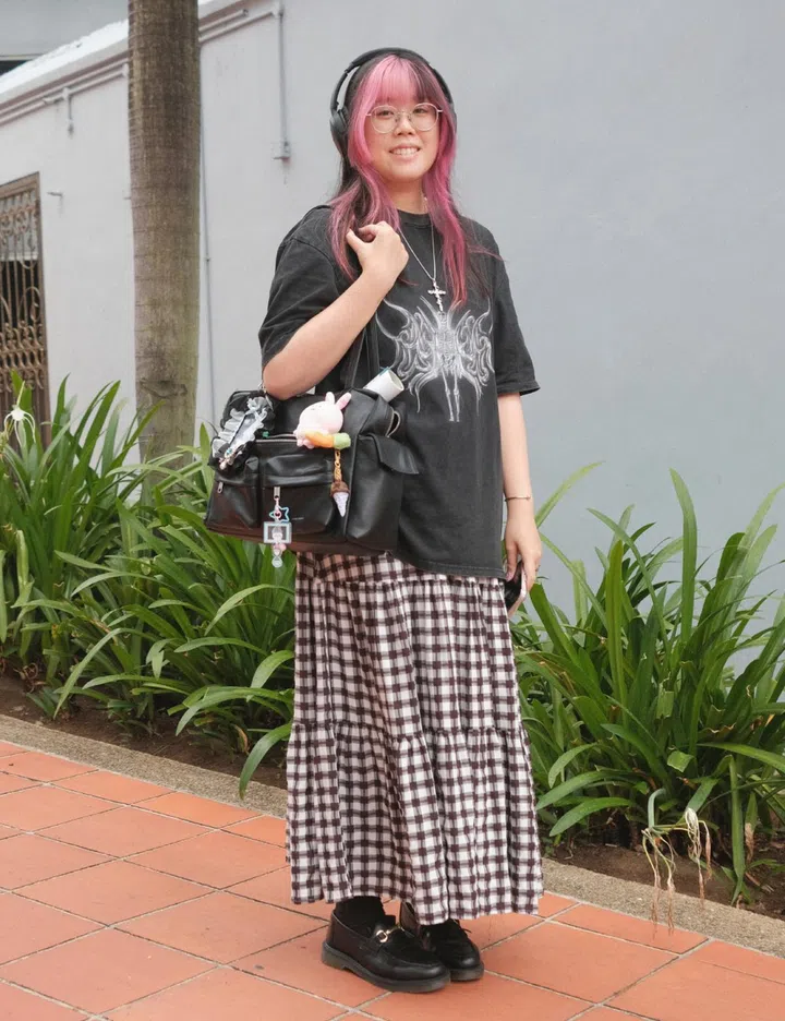 Her fit: “My shirt is from a brand called @archyped on Instagram. My skirt is from Princess Polly and my shoes are from Dr Martens. My bag is from a Korean brand called Samo Ondoh, my necklace is from a brand on Taobao called Sumiyaki, and my rings are from various shops in Japan.”