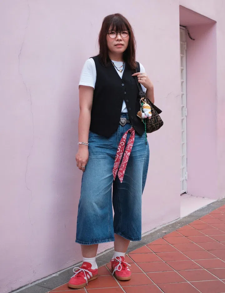 Her fit: “My T-shirt is from a Korean brand called Avahome, and my jorts are also from Korea. My waistcoat and belt are both from Zara. My shoes are Adidas Gazelles, and my bag is a vintage Fendi Baguette. For accessories, my rings are from Chrome Hearts and Gucci, and my necklace is from a store in Korea.”