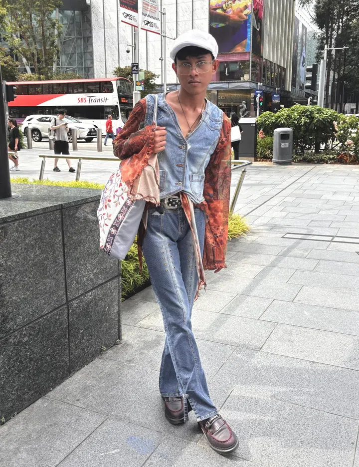 His fit: “The denim vest was thrifted from a place in Chinatown called Nearest Ten. The flowy mesh top was taken from my sister’s wardrobe. The denim flared pants were also thrifted from Nearest Ten. The shoes are from Dr. Martens, and the newsboy cap belonged to my father. I got the necklace from my aunt when she bought it in Melaka. As for my bag, I got it from Fairprice supermarket.”
