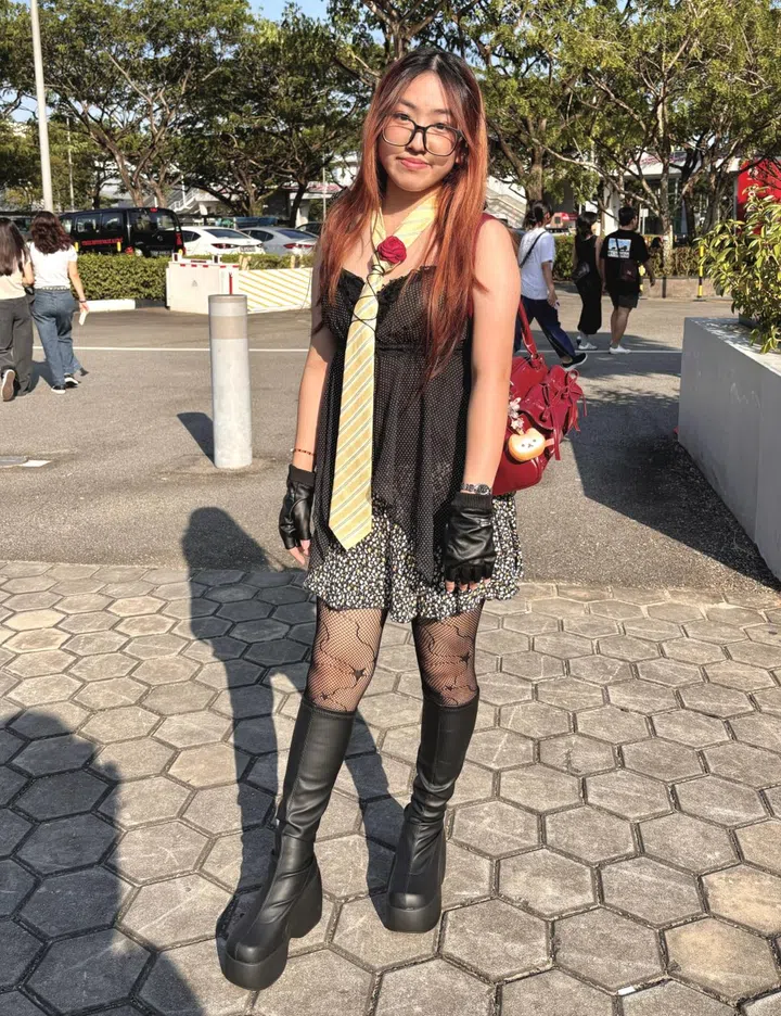 Her fit: “My top was thrifted from a shop in Bugis, and my skirt was something I found in the depths of my closet. My bag and shoes are from Taobao, while the star fishnets, gloves, and rose choker were purchased from Shopee. The tie is from Daiso.”