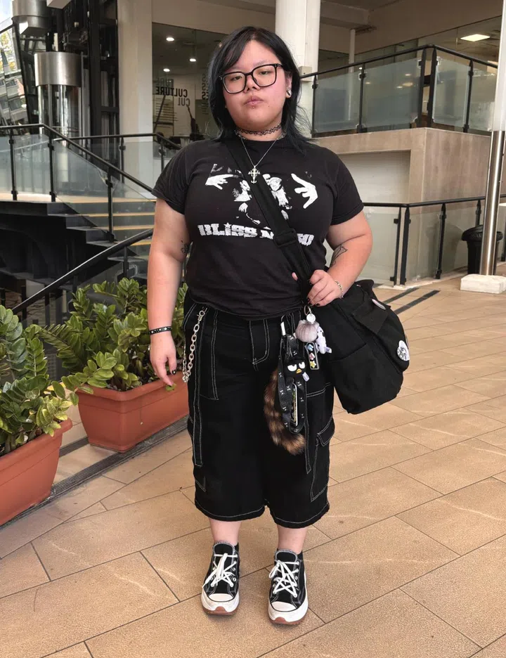 Their fit: “My top was free from a pop-up at Peace Centre. My shorts are from Shein, as it is hard for me to find good plus-size options in physical stores. My bag is from Shopee, decorated with badges that I have collected over time. My shoes are platform Converse.”
