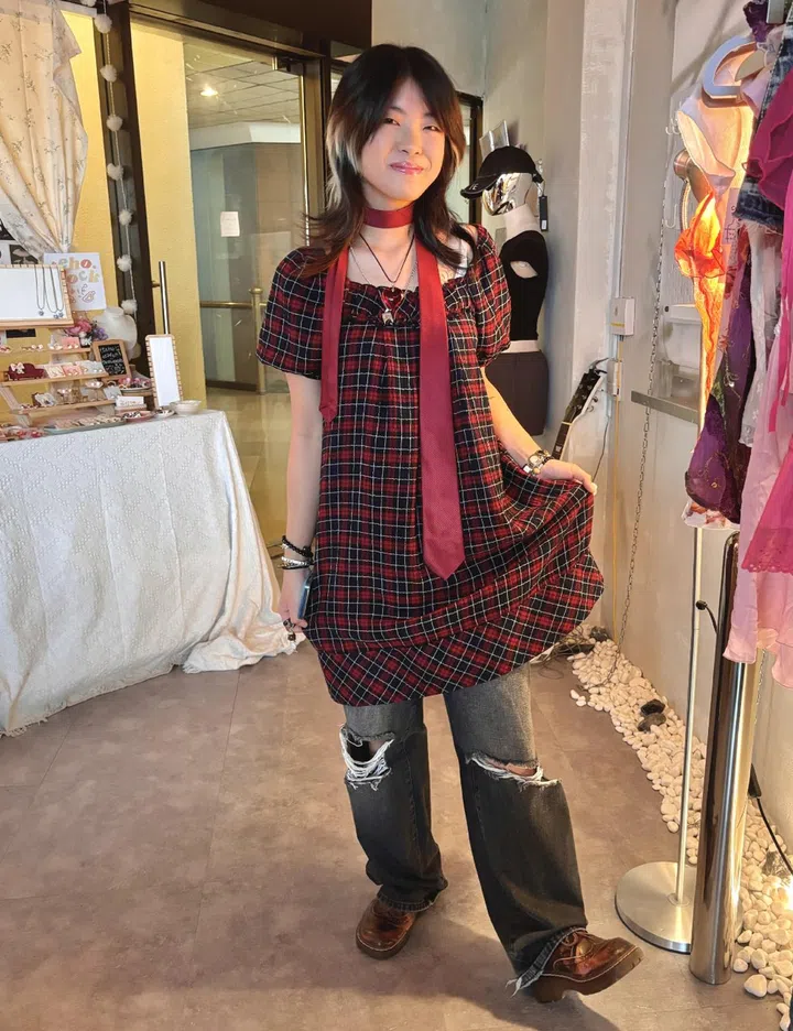 Their fit: “My top is actually a skirt stolen from my sister, and my skirt is from Uniqlo. My gloves were a gift from a friend, and my boots were purchased at a random market in Korea. The ribbon around my neck is from a dress I accidentally tore. I am wearing my mother's old necklace, along with earrings from one of the night markets in Korea, and a bag that was a free gift from Skechers.”