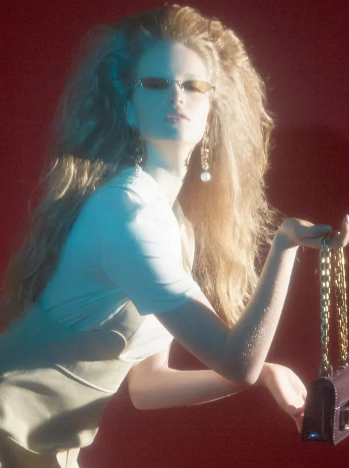 Corduroy pinafore dress and viscose shirt, Max & Co. Metal hoop earrings with crystals and glass pearls, Gucci. Metal sunglasses, Gentle Monster. J’adior calfskin shoulder bag, Dior