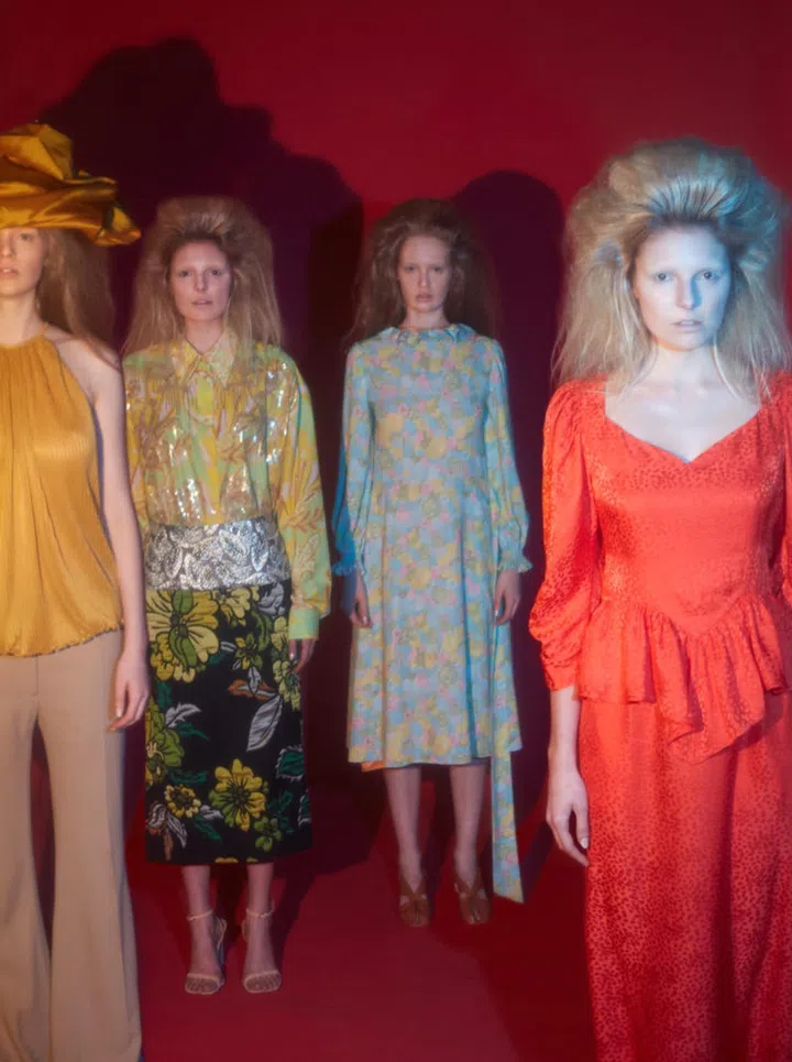 From left: Satin halter top, acetate pants, and satin hat, Mulberry. Cotton poplin shirt with sequins, jacquard midi skirt, and suede sandals, Dries Van Noten. Silk dress, Balenciaga. Leather pumps, Mulberry. Silk dress, Stella McCartney