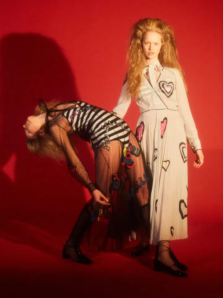 Left: Lace column dress and leather slides, Proenza Schouler. Right: Silk dress, Valentino. Brocade slides, Dolce & Gabbana