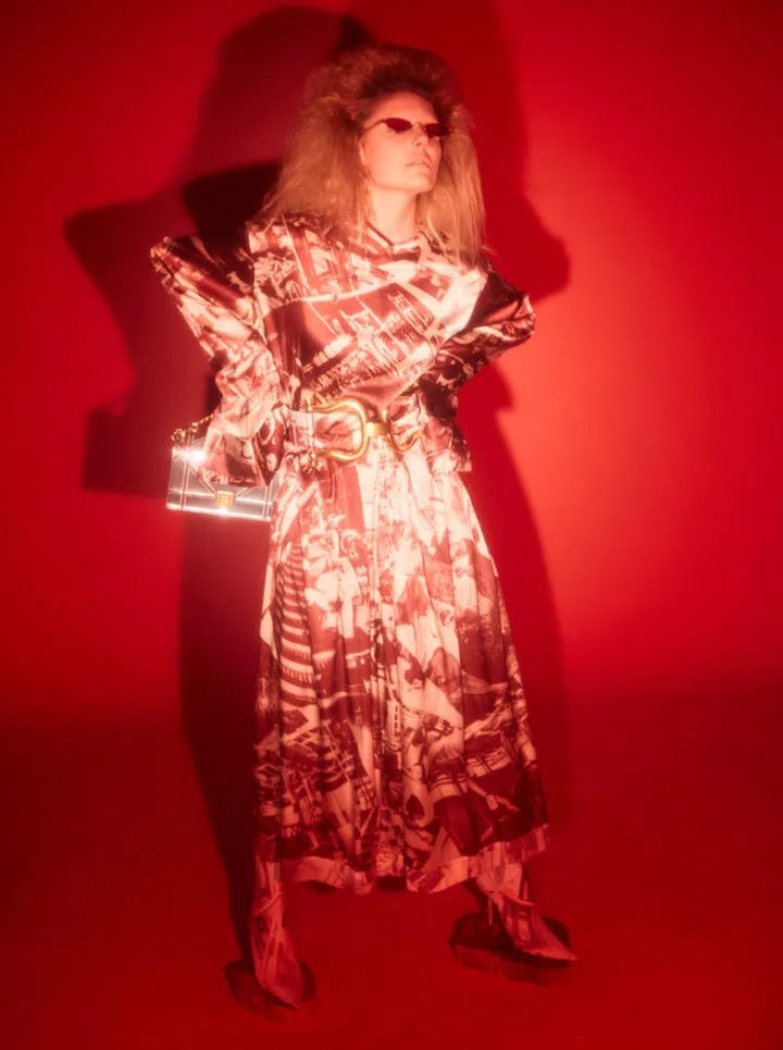 Silk top, matching midi skirt, and leather, brass and satin belt, Celine. Metal sunglasses, Gentle Monster. Diorama calfskin shoulder bag, Dior. Polyamide-blend Pantashoes, Balenciaga