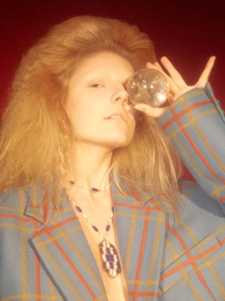 Wool jacket, Marc Jacobs. High Jewellery Serpenti 18K pink gold necklace with lapis lazuli and diamonds, Bulgari
