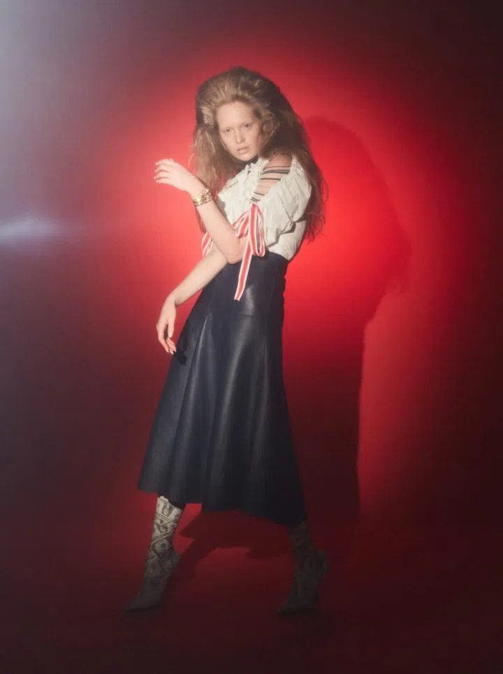 Polyester shirt, silk turtleneck top, and calfskin midi skirt, Fendi. High Jewellery Serpenti 18K pink gold bracelet with diamonds, Bulgari. Polyamide-blend boots, Balenciaga