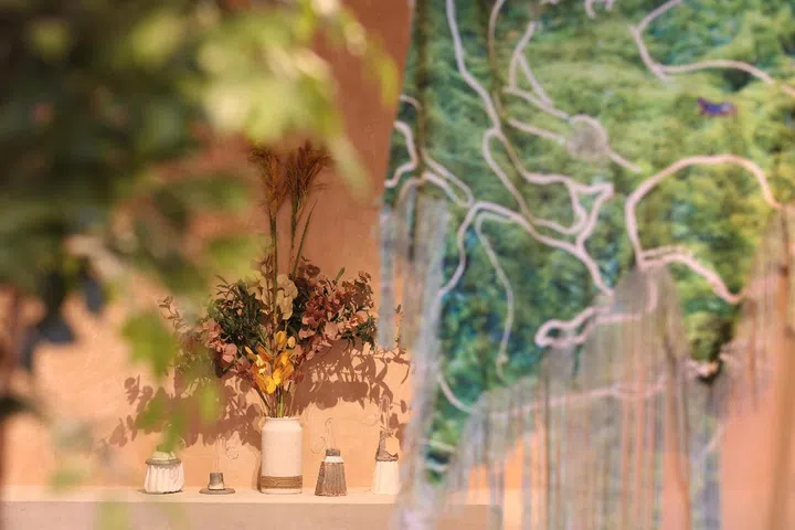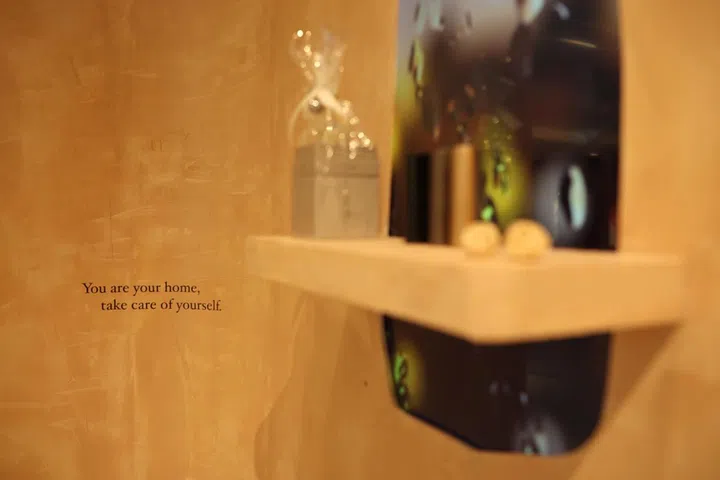 The stucco texture of the pink walls, the curved edges of the furniture and the installations made with fabric, paper and clay combine to create an organic feel. Drawing from Plato’s Allegory of the Cave, which invites one to be free from relying on just one’s five senses, the designers were philosophical with the concept and divided it into three zones representing consciousness, memories and the in-between area.