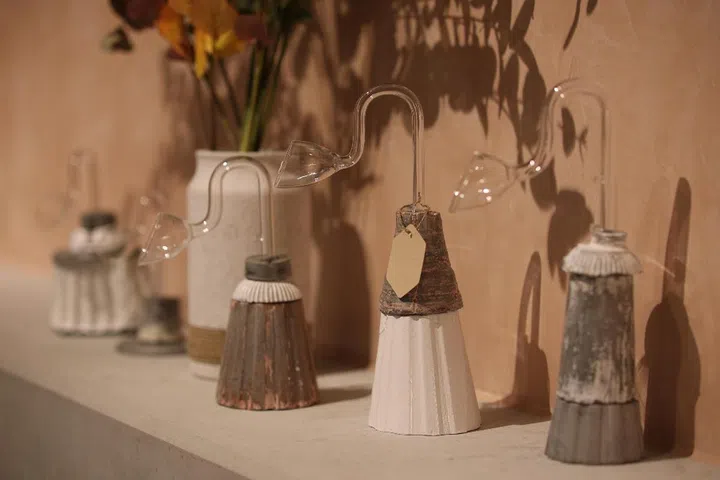 Towards the back is the scent station with a series of handcrafted diffusers made with cement, plaster and a terracotta mix. Each is fitted with a glass nozzle that dispenses the scent. Each curio in the boutique works in tandem with an ambient scent to stimulate and unearth customers’ unique memories.