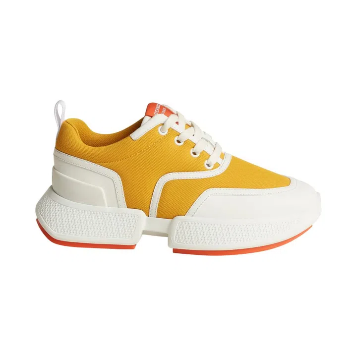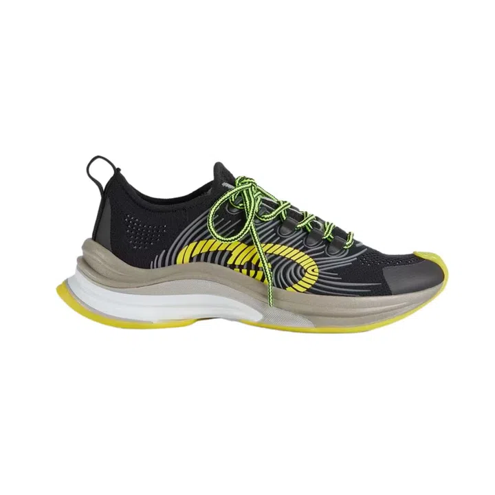 Gym shoes, but make it bougie. Technical knit is cut slim-fitted and streamline for a sleeker silhouette, with Gucci’s double-G logo abstracted into neon yellow shapes on the side.