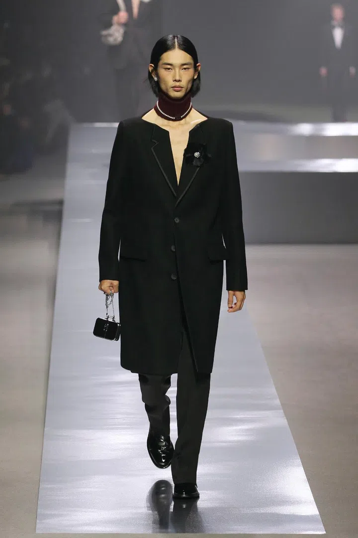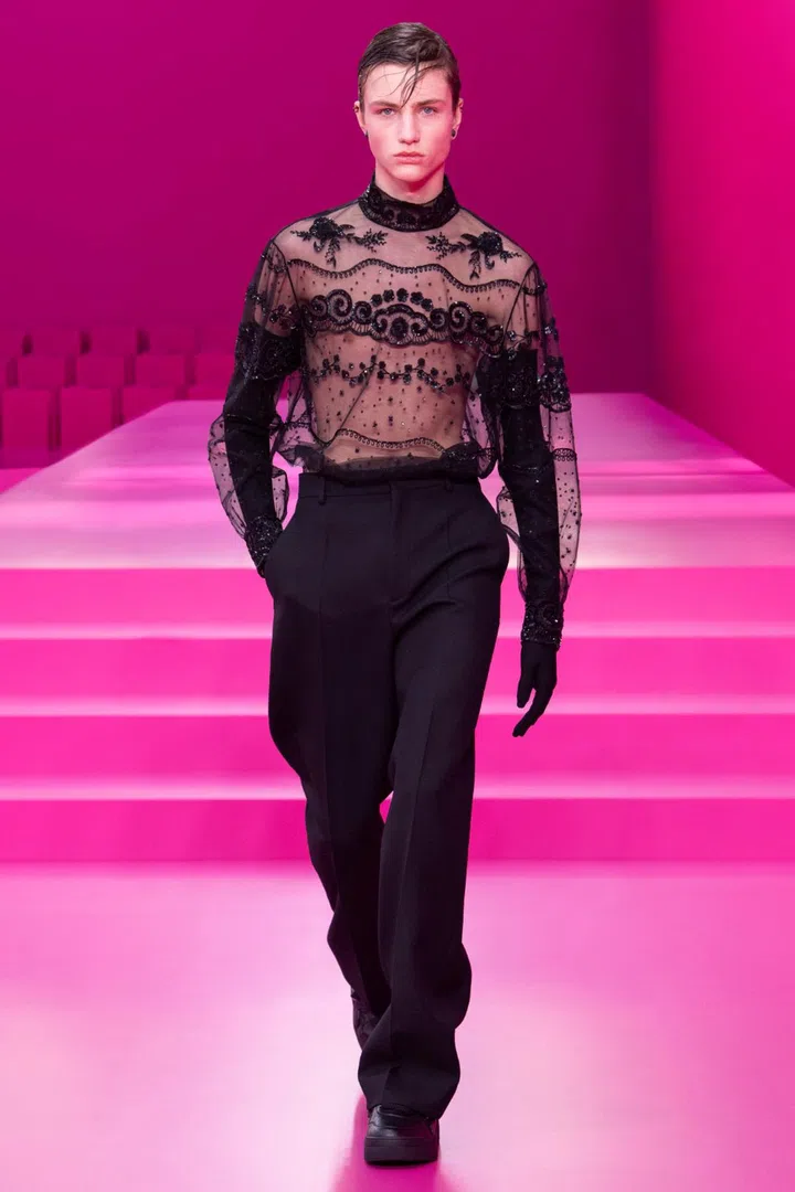 Which brings us to how the "soft boy" look has now gone mainstream. Indeed, the biggest and most powerful look in menswear these days would fit right into the women's wardrobe. The message is one of flamboyance and utmost confidence. The proof: a whole range of crop, sheer or cut-out tops; bustier or portrait necklines; the use of materials like lace and tulle; and the prettiest skirts that even brides would approve of.