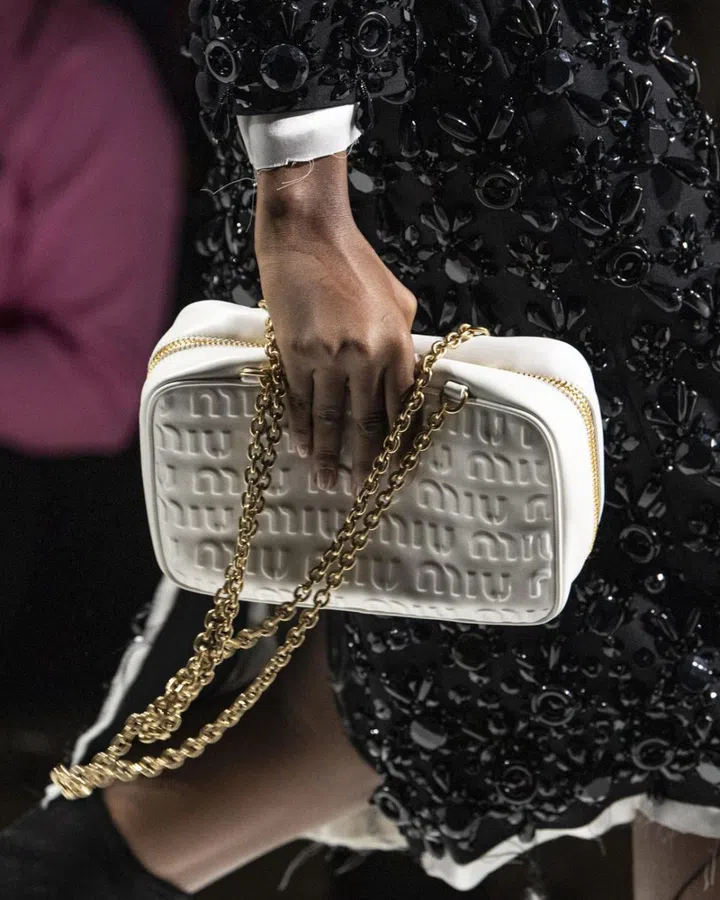 PERSONALITY: A youthful soul who enjoys shaking up the mundane, she needs no fancy name because her mix of irreverence and sensibility speaks plenty. With a pragmatic rectangular form and cushiony soft leather finish that’s been embossed all over with Miu Miu’s graphic logo, she’s both a day and night person who always looks polished, thanks to her extra long, gold-toned chain shoulder straps.
