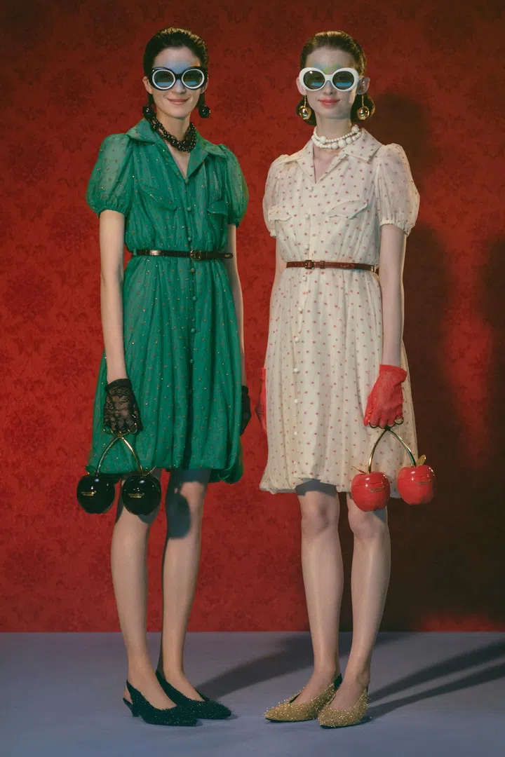 Too-cute cherry-shaped clutches with don’t-mess-with-me knuckle-duster-style handles at Undercover where Jun Takahashi has subverted the fashion of the ’50s and ’60s.