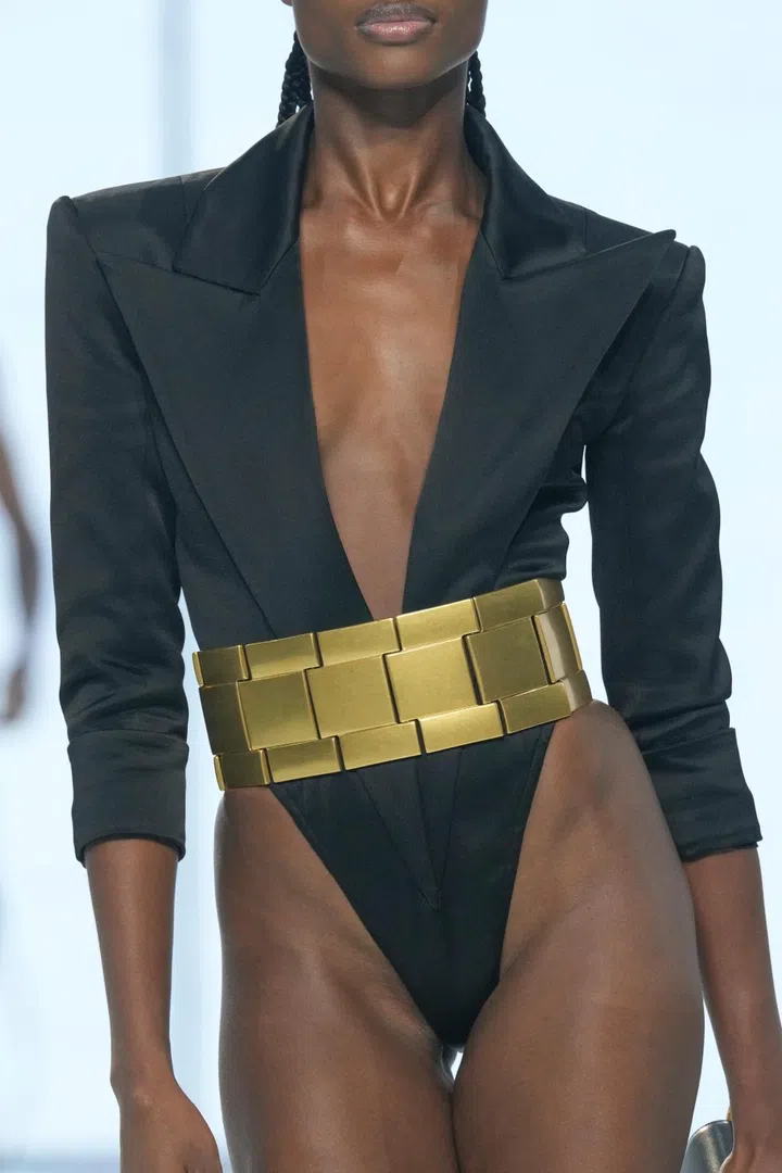 Mega upsized watch bracelets move from wrist to waist at the triumphantly body-positive Balmain.