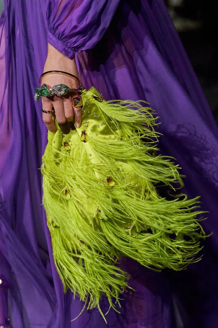 Not a dramatic fan, but an equally fly bracelet clutch embroidered with swishy ostrich feathers at Valentino, where creative director Pierpaolo Piccioli aimed to celebrate humanity and “diversity in joyous ways.”