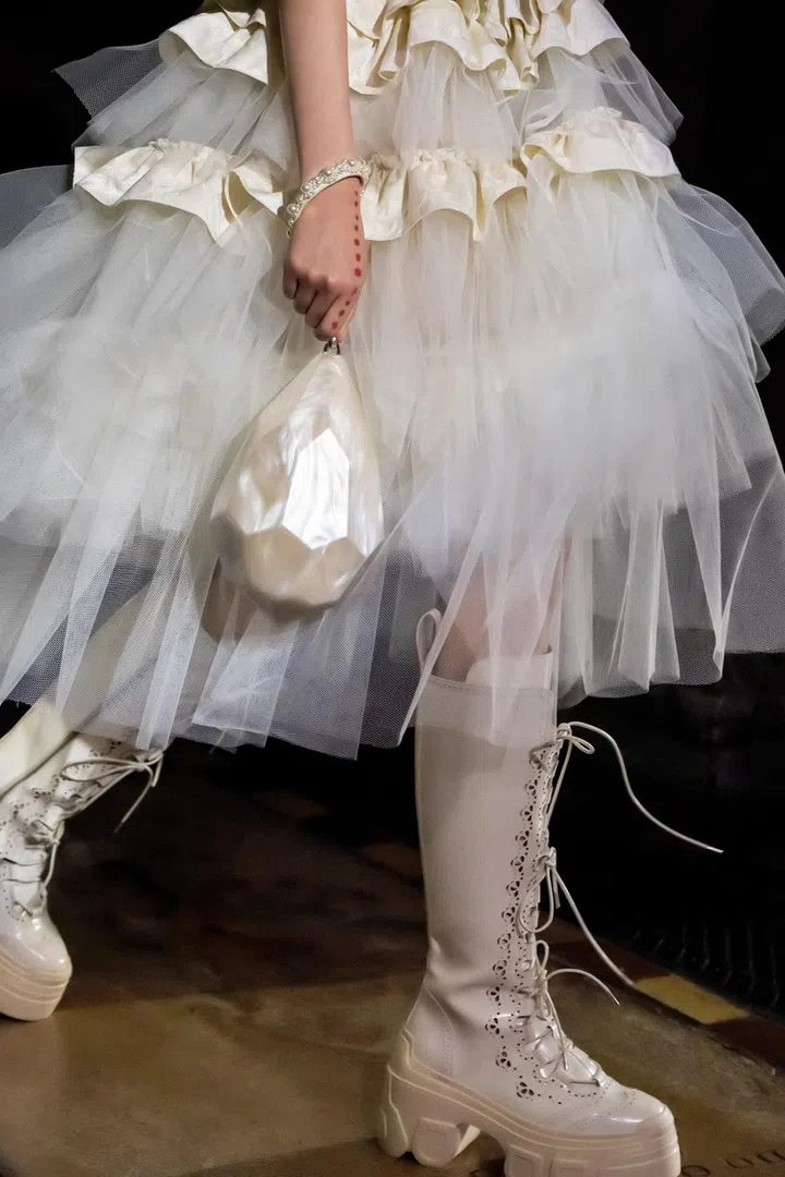 Feminine instinct growing in a pearlescent, faceted egg-slash-wristlet clutch at Simone Rocha (fun fact: the designer had given birth to her second daughter not long before the show last September).