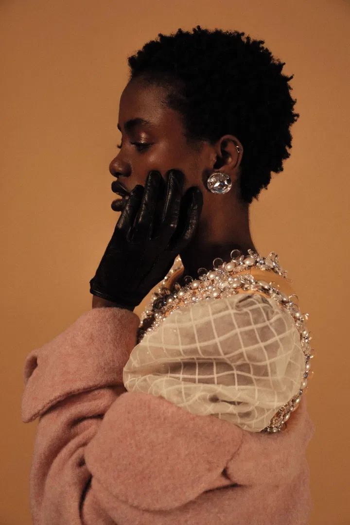 Wool coat, embellished silk gown, and leather gloves, Miu Miu. Vintage resin clip-on earrings with crystals, Foundandvision.com