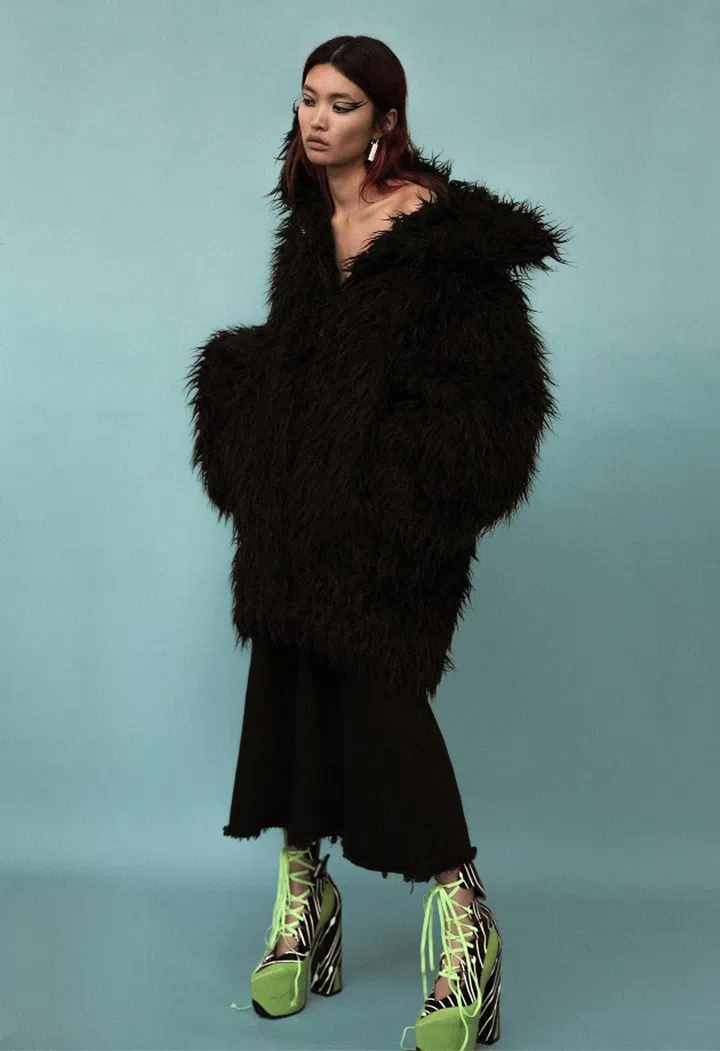 Faux fur coat, denim skirt, and brass earrings, Balenciaga. Leather platform lace-up pumps, Natachamarro.com
