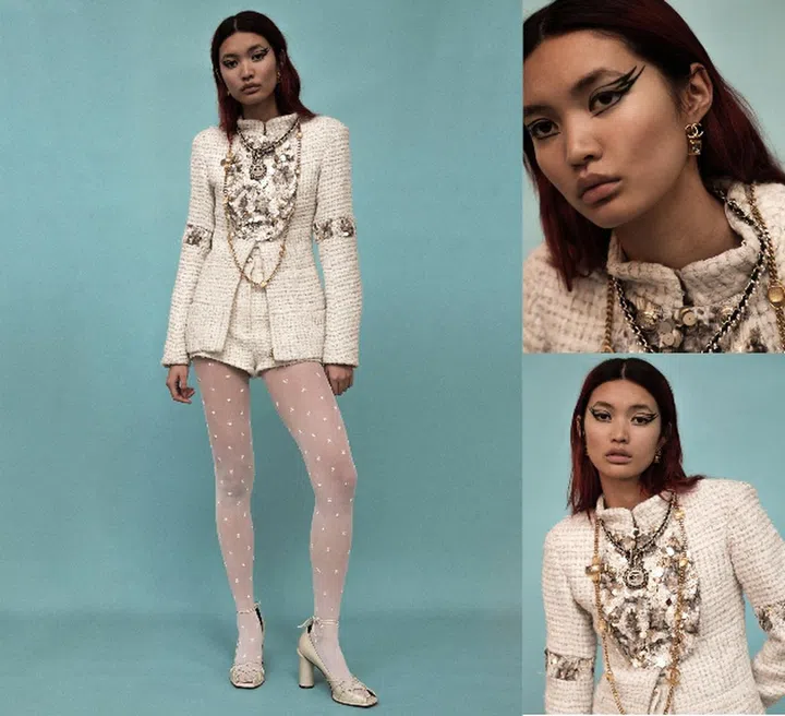 Beauty note: Contrast statement eyes with a light yet luminous sheen on the cheeks and lips. For Holiday 2020, Chanel updates its most classic shades of Rouge Allure lipstick – including the caramel beige 107 Or Beige – with golden sparkles. Also in the holiday collection: the exclusive Illuminating Blush Powder that's embossed with a chain motif and adds a translucent, slightly satiny rosy tinge.