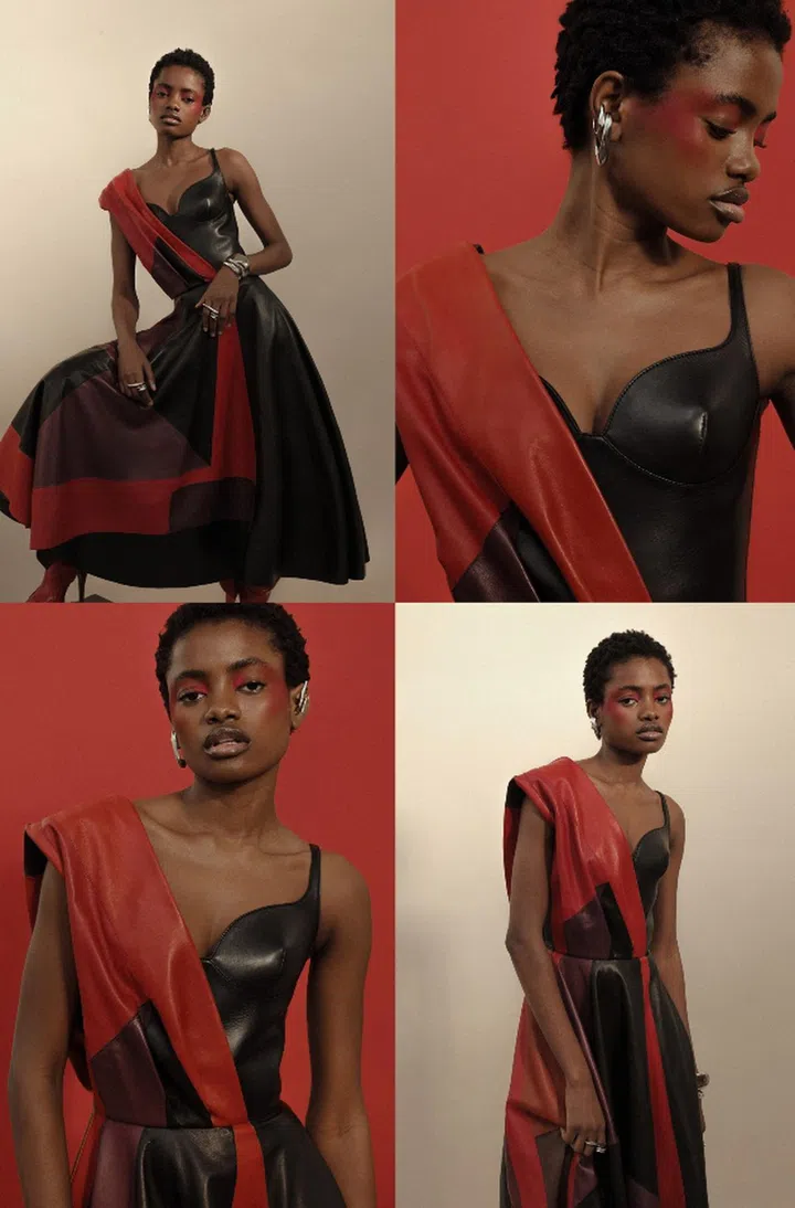 Leather gown, brass earrings, and matching bracelets and rings, Alexander McQueen