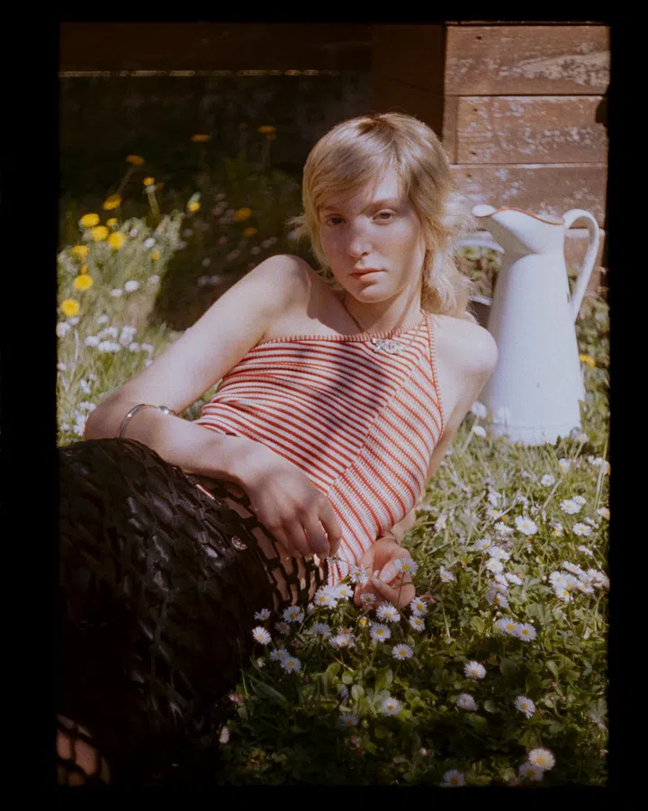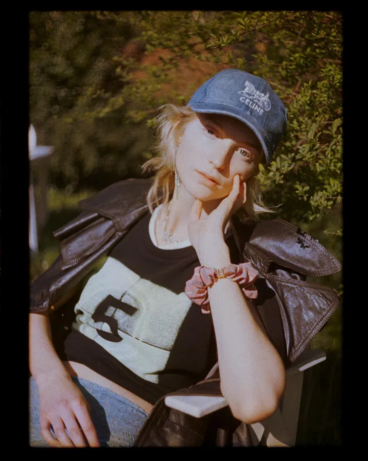 Cotton tank top, and metal and diamante necklace, Chanel. Cotton-blend lace shorts, Stella McCartney. Celine by Hedi Slimane denim baseball cap, and silk and brass scrunchie, Celine. Metal earrings, @mathildemrnr. Polyester-blend socks, emiliocavallini.com. Leather pumps, Loewe. Trench coat, stylist’s own