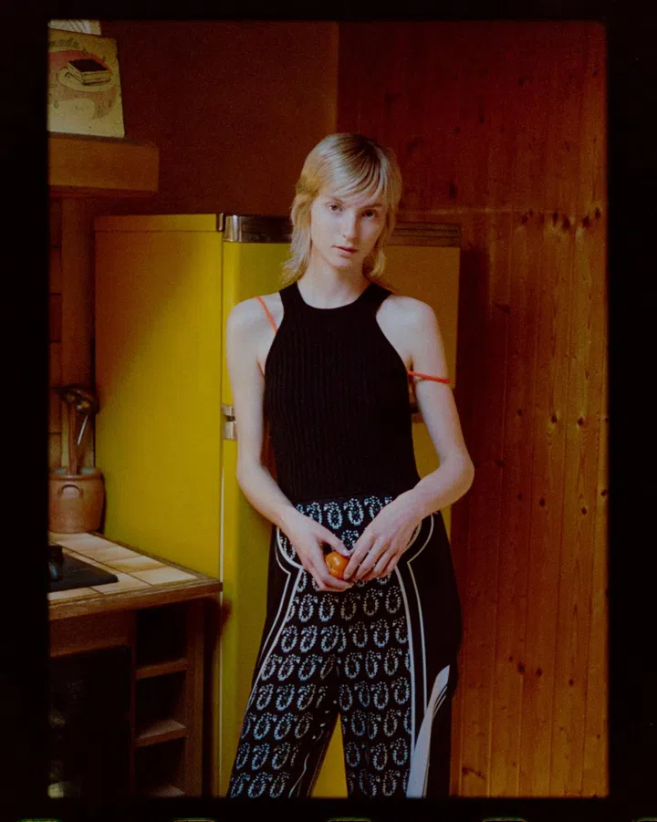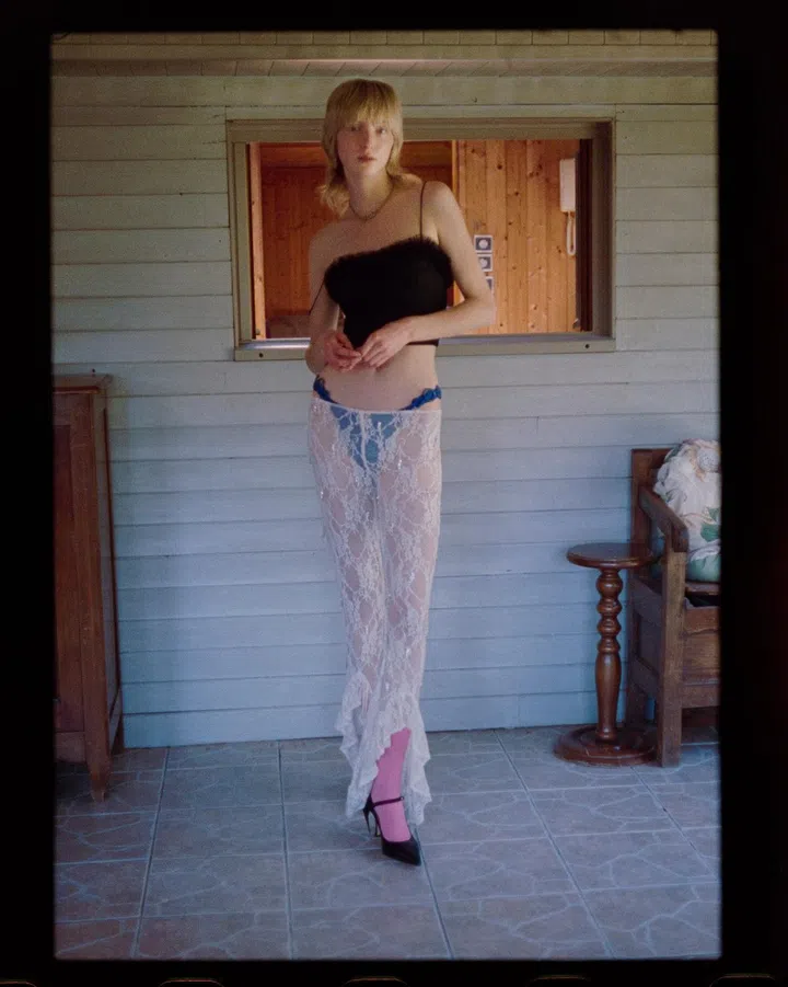 Celine by Hedi Slimane silk top, Celine. Nylon lace trousers, @mathildemrnr. Nylon-blend bikini bottoms, Eres. Metal and diamante necklace, Chanel. Polyester-blend socks, emiliocavallini.com. Leather pumps, Loewe