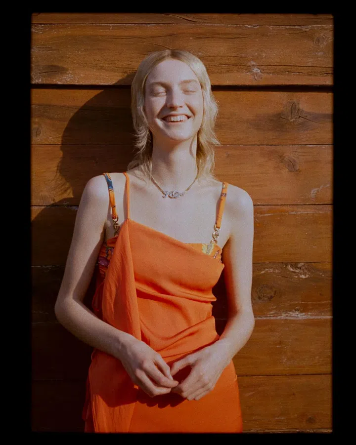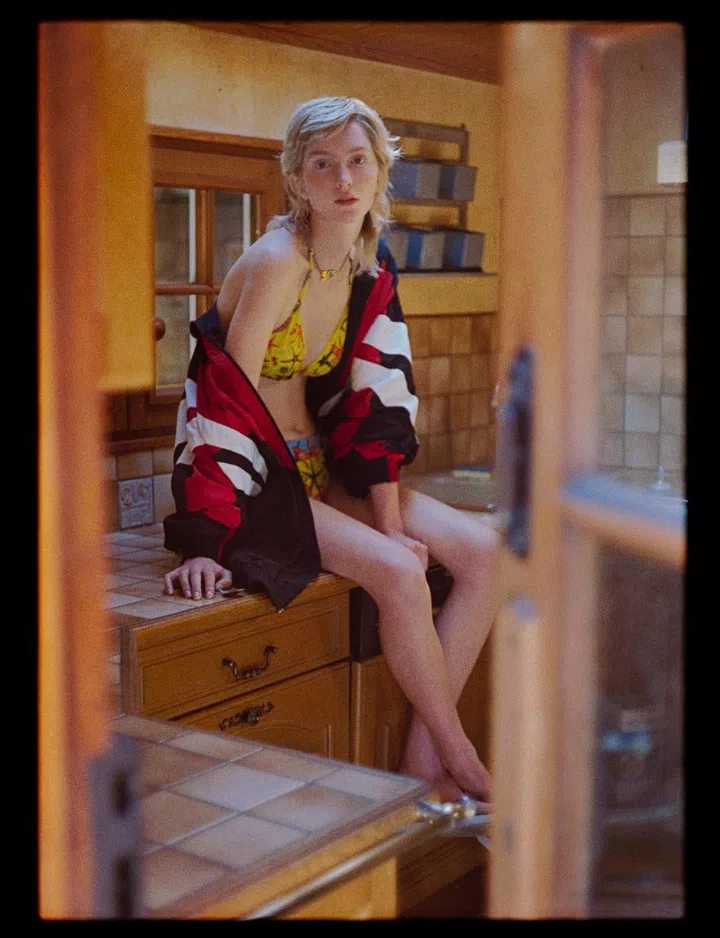 Recycled nylon jacket, Balenciaga. Polyester-blend bikini top and matching bottoms, Versace. Metal and diamante necklace, Chanel. Slippers, stylist’s own