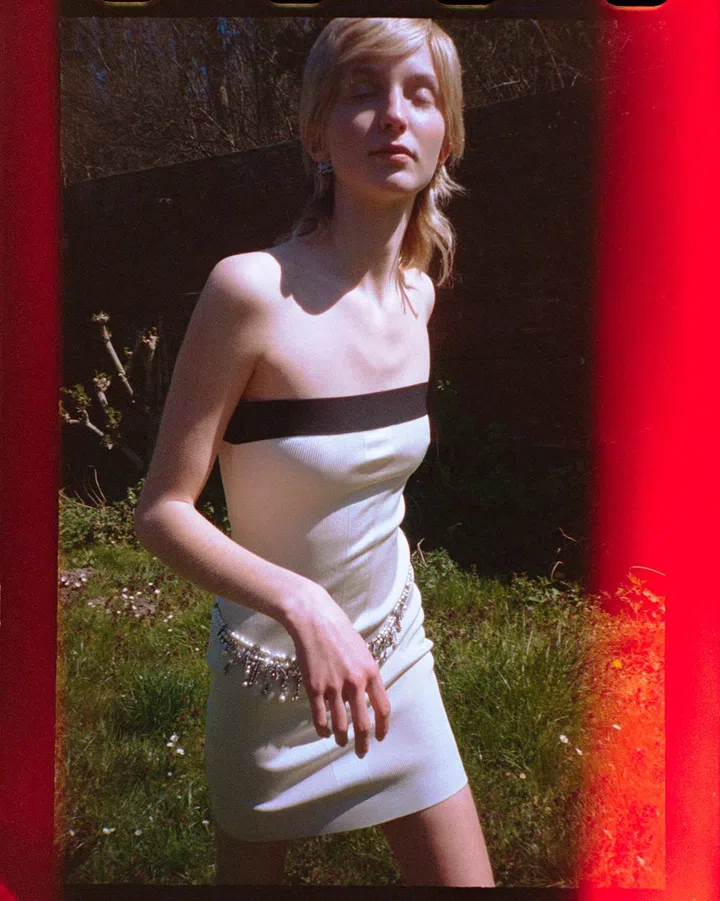Cotton top and brass bracelet, Chloe. Cotton macrame dress (worn as a skirt), Longchamp. Metal and diamante necklace, Chanel. Shorts, stylist’s own
