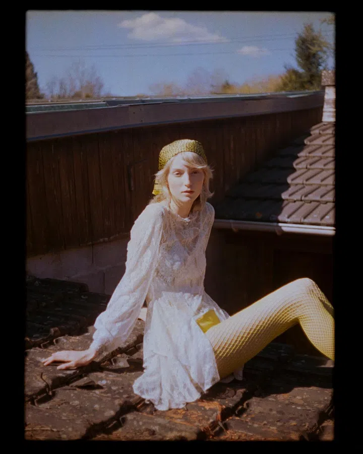 Nylon lace dress and metal earrings, @mathildemrnr. Commission viscose-blend bra, ssense.com. Silk-blend scarf (worn as a bandana) and mesh leggings, Dior